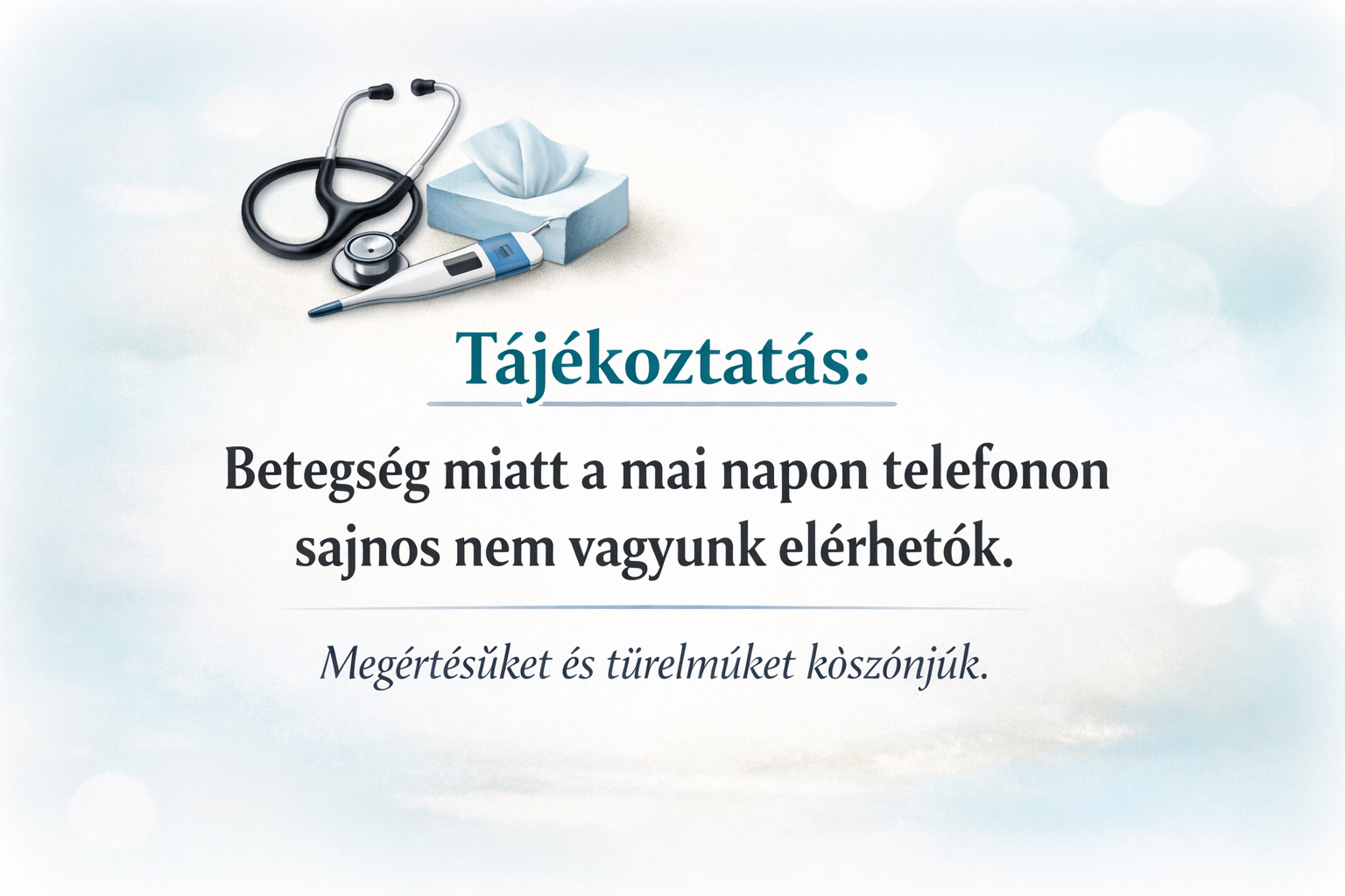 Betegség miatt a mai napon – április 13-án, hétfőn – telefonon sajnos nem tudjuk hívásaikat fogadni.